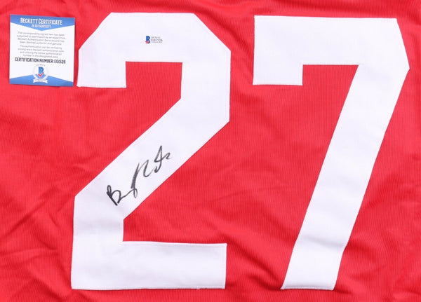 This autographed Custom on-ice style jersey, with everything sewn on, size XL. Has been hand-signed by Brady Tkachuk.The autograph includes an official Beckett Authentication Services serially-numbered scannable hologram and QR Code card for authenticity purposes.Authentication: Beckett Scannable Hologram with QR Code cardCustom on-ice style jerseys are a more affordable option for autograph seekers. These jerseys do not have any brand name or tags and are made in the Philippines. They feature stitched on names and numbers and are made to look very similar to the on-field jerseys that the players wear. These custom jerseys are very commonly used in the memorabilia industry.