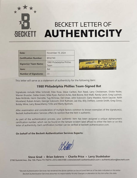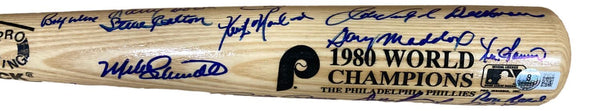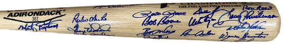 Featured is a 1980 Philadelphia team signed Rawlings Adirondack bat. This bat has been hand signed by Mike Schmidt, Pete Rose, Steve Carlton, Ron Reed, Larry Christensen, Dickie Noles, Warren Brusstar, Dallas Green, Mike Ryan, Ramon Aviles, Bob Boone, Bob Walk, Randy Lerch, Greg Luzinski, Bake McBride, Herm Starrette, Tug McGraw, Del Unser, John Vukovich, Gary Maddox, Kevin Saucier, Keith Moreland, Ruben Amaro, George Vukovich, Dick Ruthven, Lee Elia, Billy DeMars, Lonnie Smith, Greg Gross, Bobby Wine, Larry Bowa, Manny Trillo, and Mart Bystrom and comes with the Beckett hologram and letter of authenticity. This bat would make a great addition to any sports memorabilia collection! SPECIFICATIONS Autographed By: Team: Philadelphia Phillies Sport: Baseball Authentication: Beckett Grading Services