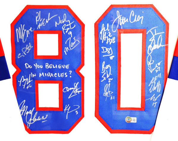 Relive the "Miracle on Ice" with this one-of-a-kind team signed 1980 Team USA Custom #80 MIRACLE Hockey Jersey in an LED Lighted Frame. This authentic jersey features signatures, including Beckett-Witnessed signatures from players such as Rob McClanahan, Bill Baker, and Jim Craig. List of signatures from the Beckett certificate are: Dave Silk **Beckett Witnessed on 9/5/2024 in Bloomington, MN** Also signed by Rob McClanahan. **Beckett Witnessed on 9/5/2024 in Bloomington, MN** Also Signed by Bill Baker. **Beckett Witnessed on 9/9/2024 in Bloomington, MN** Also signed by Neal Broten, Dave Christian, Steve Christoff, Mike Eruzione, Steve Janaszak, Mark Johnson, Ken Morrow, John O'Callahan, Mike Ramsey, William "Buzz" Schneider, Eric Strobel, Phil Verchota, Craig Patrick & John Harrington. **Beckett Witnessed on 9/19/2024 in Bloomington, MN** Inscription by John Harrington reads "Do you Believe in Miracles?". Also Signed by Jim Craig. **Beckett Witnessed on 9/21/2024 in Bloomington, MN** With an inscription by John Harrington, this framed piece is a must-have for any hockey fan. Do you believe in miracles? Own a piece of history today!