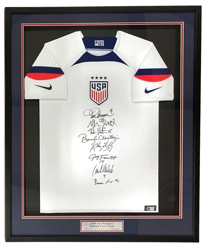 Featured is a Mia Hamm, Michelle Akers, Brandi Chastain, Joy Fawcett, Kristine Lilly, Carla Overbeck, Briana Scurry, and Tisha Venturini signed USA Nike women's soccer jersey. This jersey comes with the Beckett witnessed hologram and certificate of authenticity. This jersey is size Medium. This jersey has been professionally framed and matted and is approximately 28x34. This jersey would make a great addition to any sports memorabilia collection!. SPECIFICATIONS Autographed By: Team: USA Sport: Soccer Authentication: Beckett Grading Services