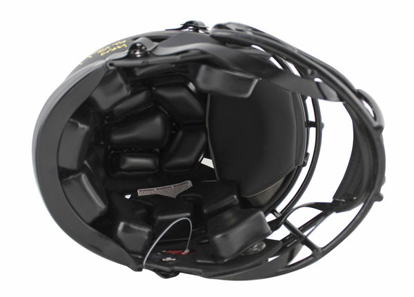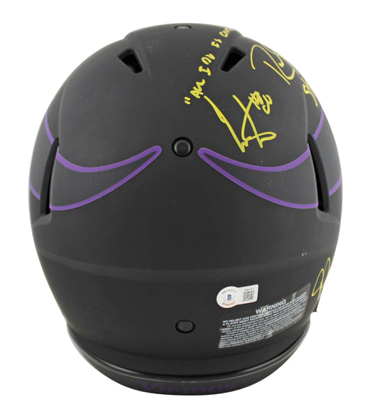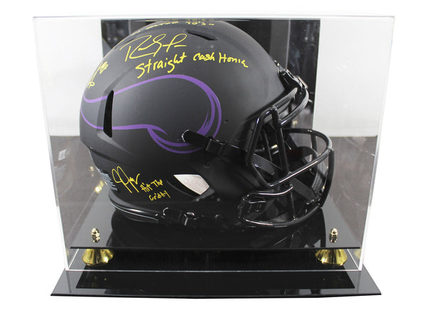 This Autographed Alternate Eclipse Riddell Full Size Speed Proline Helmet W/ Uv Mirrored Back Acrylic Display Case with the inscription of "Hit The Griddy (Jefferson), Straight Cash Homie (Moss), All I Do Is Catch TDs (Carter)" has been Personally Signed by Justin Jefferson, Randy Moss, & Cris Carter of the Minnesota Vikings. This item is 100% Authentic to include a hologram by Beckett Authentication Services. This item will come with an affixed Beckett Authentication Services (BAS) authentication sticker, which includes a scannable QR code to verify authenticity. Please note that Beckett no longer provides serial-numbered COA cards, and the attached BAS sticker will serve as the complete authentication for this item. This is a BAS Witnessed Protection Program item which means a Beckett Authentication Service representative was present when this item was being signed. We conducted an autograph signing with Justin Jefferson, Randy Moss, & Cris Carter where multiples of the same item were signed. While the photographs are representative of this item, the size, placement and strength of the signature may vary. Each item is hand signed, therefore, each autograph is unique. This item can be verified through BAS Witnessed.
