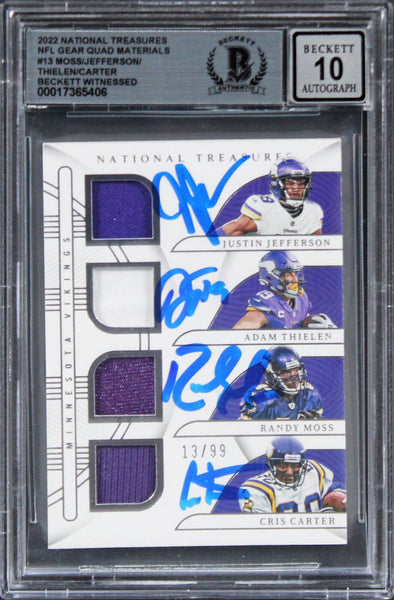 This Autographed Auto Graded Gem Mint 10! 2022 National Treasures NFL Gear Quad Materials #3 #13/99 Card has been Personally Signed by Randy Moss, Cris Carter, Justin Jefferson & Adam Thielen of the Minnesota Vikings. This item is 100% Authentic, it comes slabbed and authenticated by Beckett Authentication Services. The authenticity can be verified on Beckett Authentication Services website.