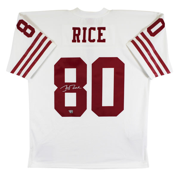 This Autographed White Mitchell & Ness Jersey has been Personally Signed by Jerry Rice of the San Francisco 49ers. This item is 100% Authentic to includes a numbered hologram by Fanatics. We conducted an autograph signing with Jerry Rice where multiples of the same item were signed. While the photographs are representative of this item, the size, placement and strength of the signature may vary. Each item is hand signed, therefore, each autograph is unique. This item can be verified through Fanatics. This is a X-Large sized Jersey.
