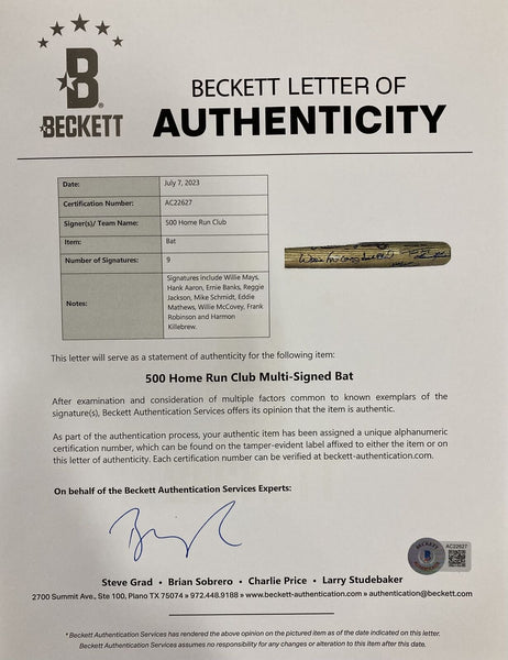 Featured is a Willie Mays, Hank Aaron, Ernie Banks, Reggie Jackson, Mike Schmidt, Eddie Mathews, Willie McCovey, Frank Robinson, and Harmon Killebrew signed Rawlings baseball bat. This bat has been hand signed by Mays, Aaron, Banks, Jackson, Schmidt, Mathews, McCovey, Robinson, and Killebrew and comes with the Beckett hologram and letter of authenticity. This bat would make a great addition to any sports memorabilia collection! SPECIFICATIONS Autographed By: Team: Sport: Baseball Authentication: Beckett Grading Services
