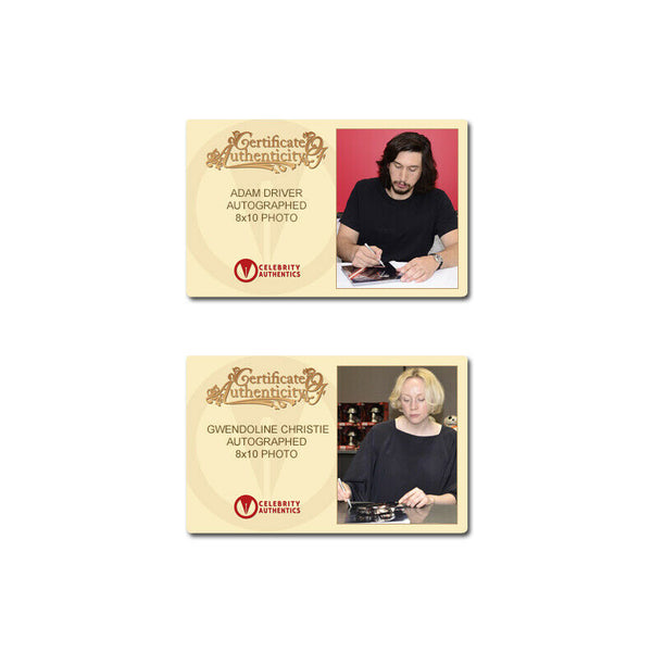 From the Framing Studios of Celebrity Authentics is this Star Wars: The Force Awakens Commanders Kylo Ren and Captain Phasma 8x10 framed photos (approximately 18"x22" finished) personally hand-signed by Adam Driver and Gwendoline Christie during their signings with Celebrity Authentics. Kylo Ren and Captain Phasma are two prominent villains from the Star Wars sequel trilogy who served in the First Order. Kylo Ren was the dark side-wielding enforcer and later Supreme Leader, while Phasma was the chrome-armored commander of the First Order's stormtroopers. While they were both high-ranking officers under Supreme Leader Snoke, their relationship was that of commanding and subordinate characters within the First Order. Photos are affixed with Celebrity Authentics serial-numbered and tamper evident Authentication Hologram and includes Celebrity Authentics Certificates of Authenticity featuring picture of each signing photo.Framing: Photo is meticulously dry mounted and framed using acid free backing and mat boards with white core for the finest in presentation. UV protective glass with precision cut moulding are used for smooth, clean frame edges, hand assembled in our studio. Additionally, a protective back cover is used to seal the piece with corner bumpers applied to protect your walls, providing adequate air flow. A hanger is affixed to complete the finished collectible. Each framed photo is carefully wrapped for shipping with double protective corners and cushioning to help ensure the item's safe arrival. Celebrity Authentics Framing Studios - acclaimed as the industry's finest! Please note: with multiples signed by the actor, a sample photo is used from stock to represent what you will receive. Exact autograph size and placement may vary.