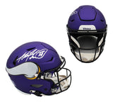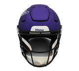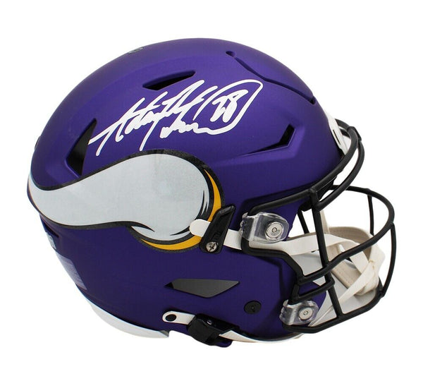 A Minnesota Vikings Speed Flex Authentic NFL Helmet hand signed by Adrian Peterson. The item and signature are in excellent condition. Adrian Peterson is a former professional American football running back. Peterson played college football at the University of Oklahoma, where he became a standout before entering the NFL in 2007. He was drafted by the Minnesota Vikings with the 7th overall pick. Over his career, he set numerous records, including the NFL single-season rushing yards record with 2,097 yards in 2012, just eight yards shy of breaking the all-time record. He was a seven-time Pro Bowl selection and an NFL MVP in 2012. Peterson played for multiple teams during his career, including the Minnesota Vikings, New Orleans Saints, Arizona Cardinals, Washington Football Team, and briefly with the Tennessee Titans. He retired with over 14,000 rushing yards, ranking him fifth on the NFL's all-time rushing list. AUTHENTICATION: The item has been tagged with a Beckett Serial Numbered and Databased Hologram.