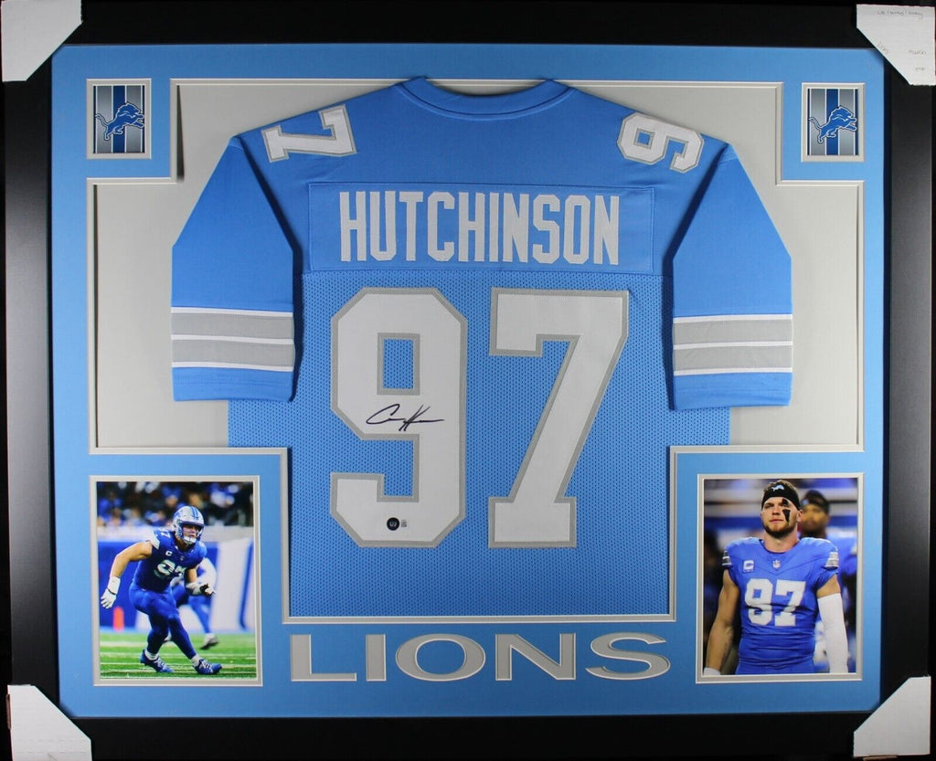 AIDEN HUTCHINSON (Lions new blue SKYLINE) Signed Autograph Framed Jersey Beckett