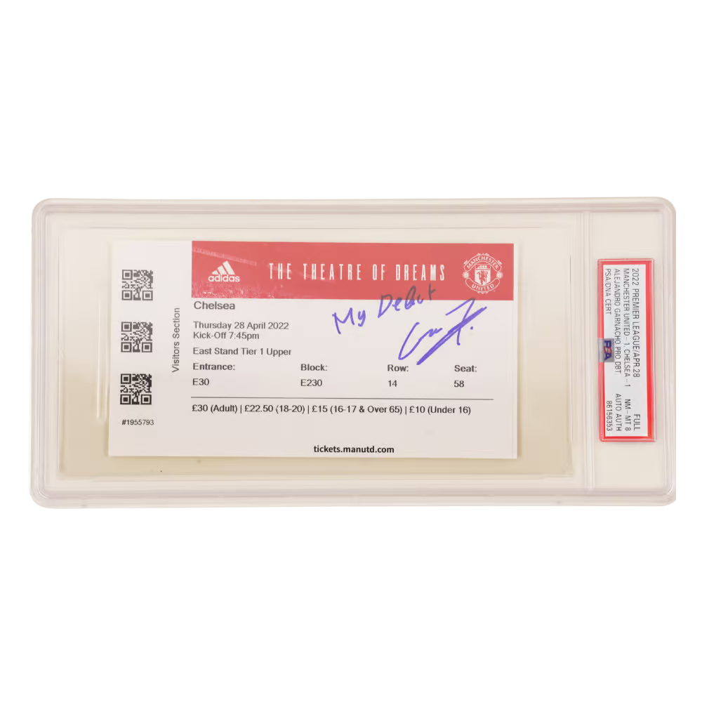 This is a Alejandro Garnacho Signed Pro Debut Match Ticket Inscribed My Debut - PSA 8. THE ITEM IN THE PICTURE IS A STOCK IMAGE. YOU WILL RECEIVE AN IDENTICAL ITEM OF EQUAL QUALITY. ALL JERSEYS ARE SIZE LARGE. Every item of signed memorabilia we sell is official and of the highest quality. We pride ourselves on providing sports fans with the most exclusive signed memorabilia on the market. We are an industry leading signed memorabilia company who can guarantee 100% authenticity on every signature we sell. The item you receive will be identical to the one you are seeing in the stock pictures. This includes the item, the authentication company, signature color and signature placement. We take pride in ensuring the authenticity of all our items. With unwavering commitment, we guarantee that every signature is 100% authentic. Every item of signed memorabilia comes with a scannable barcode which takes you to the certificate of authenticity on the company's website. These industry leading authentication companies include Beckett Authentication Services, James Spencer Authentication Services and Professional Sports Authentication Services.