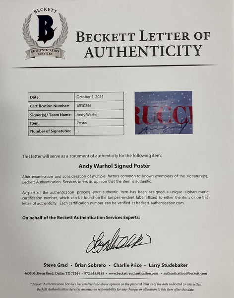 Featured is an Andy Warhol signed 20x24 poster. This poster has been hand signed by Warhol and comes with the Beckett hologram and letter of authenticity. This poster has been professionally framed and matted and is approximately 26x32. This poster would make a great addition to any sports memorabilia collection! SPECIFICATIONS Autographed By: Andy Warhol Team: Sport: Authentication: Beckett Grading Services