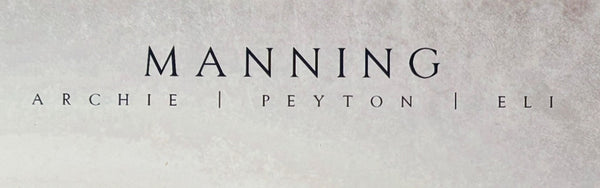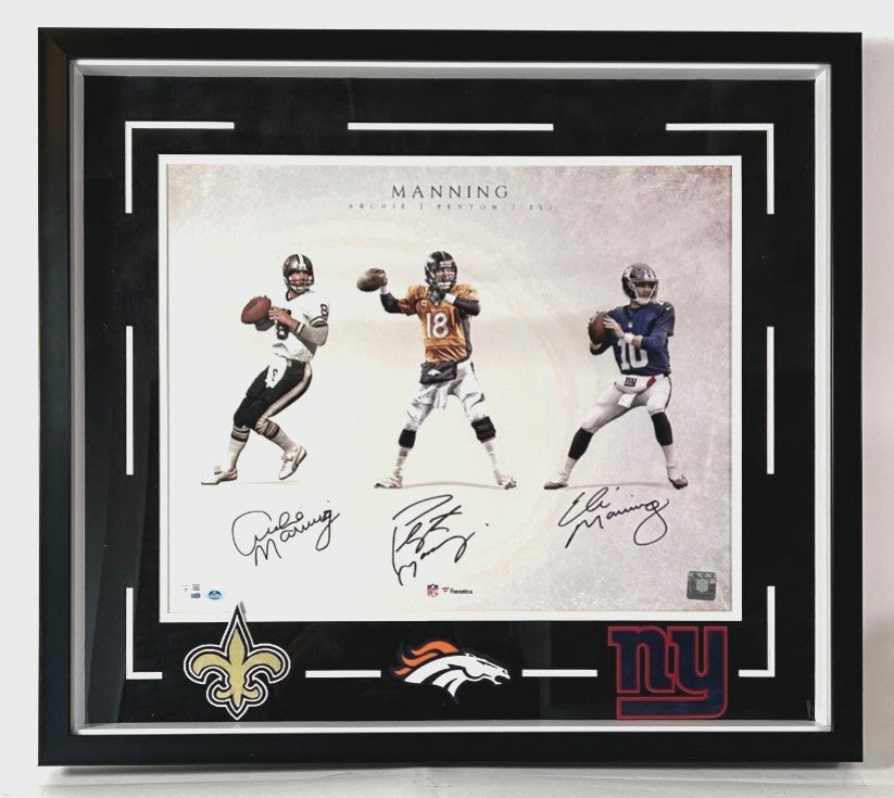 The First Family of Football - Generations of Greatness Own a piece of NFL history with this extraordinary Manning Family autographed photo featuring three icons of football excellence. This premium collectible showcases Archie, Peyton, and Eli Manning together in a stunning 27.5"x24" professional frame: Triple authentic signatures - Archie, Peyton, and Eli Manning Fanatics Certificate of Authenticity - guaranteed genuine autographs Premium 27.5"x24" professional framing - museum-quality presentation High-quality photo print - captures the Manning legacy beautifully Professional matting and mounting - ready to display masterpiece This remarkable piece celebrates the incredible Manning football dynasty: Archie, the Saints and Oilers quarterback who paved the way; Peyton, the five-time NFL MVP and two-time Super Bowl champion; and Eli, the two-time Super Bowl MVP who conquered the Patriots twice in the biggest games. Manning Family Legacy: Combined, they represent over 50 years of NFL excellence, 7 Pro Bowl selections for Archie, 14 Pro Bowls and 5 MVPs for Peyton, plus 4 Pro Bowls and 2 Super Bowl MVPs for Eli. No family has contributed more to professional football. Perfect for: NFL collectors, Manning family fans, football memorabilia enthusiasts, Saints/Colts/Broncos/Giants fans, luxury home decor, office displays The sophisticated professional framing creates a museum-worthy presentation that honors three generations of football greatness. With Fanatics authentication, you're guaranteed genuine signatures from football's most celebrated family. Secure this tribute to the Manning legacy - a family whose impact on football will be felt for generations to come.
