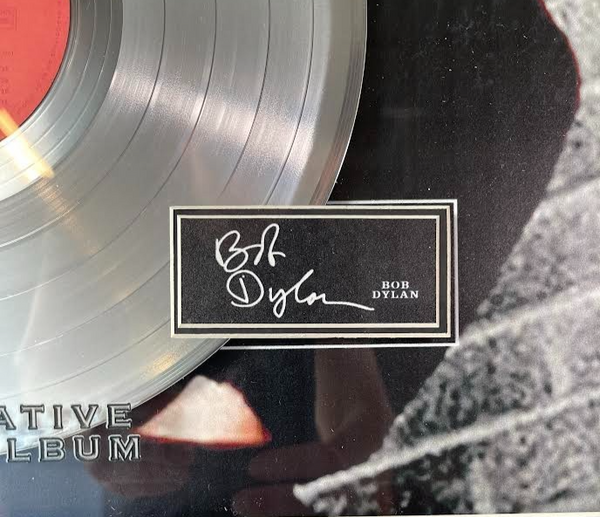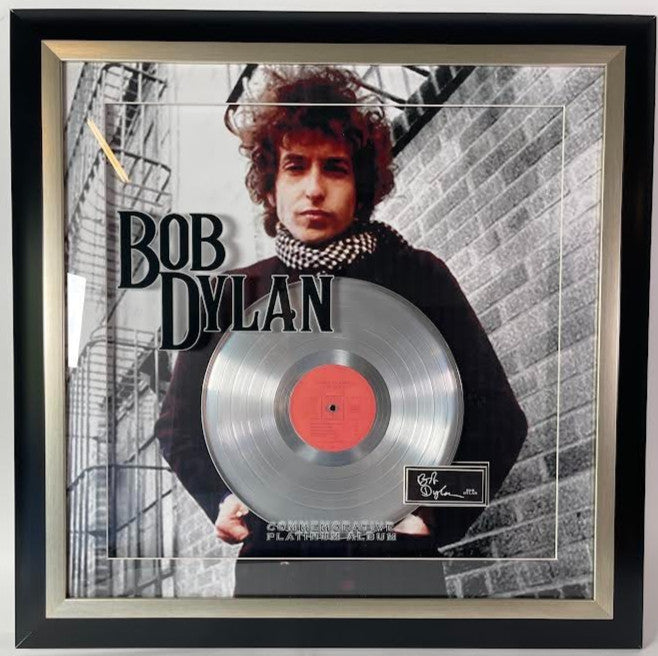 The product is a framed commemorative platinum album by Bob Dylan, featuring a laser engraved signature. This collectible item is a piece of music memorabilia that pays homage to the iconic singer-songwriter. The platinum album adds a touch of exclusivity and prestige, making it a desirable item for fans and collectors of Bob Dylan's work. The laser engraved signature adds a unique and special touch to the overall design, making it a one-of-a-kind piece for any music enthusiast's collection.