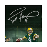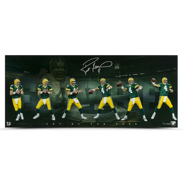 Brett Favre earned the nickname "The Gunslinger" with some amazing plays throughout his career. Favre holds the record for most consecutive starts in the NFL with a streak of 297 games. In his first season with the Packers, Favre helped put together a six-game winning streak that was the most consecutive wins the team had since 1965. In his second season, Favre led the Packers to their first playoff berth since 1982 and was also named to the Pro Bowl for the second time in a row. The following season, the Packers advanced to the playoffs again with a 9-7 record. In the 1995 season, the Packers finished with an 11-5, record which was Green Bay's best record in approximately 30 years. "Art of the Pass" is an exclusive Upper Deck Authenticated designed collage of Green Bay Packers Hall of Famer Brett Favre. The designed 36" x 15" image (limited to 74) depicts six images of Favre as he prepares for a pass. Favre has autographed this limited edition image in silver paint pen. His autograph is deemed authentic by virtue of Upper Deck Authenticated's Five-Step Process.