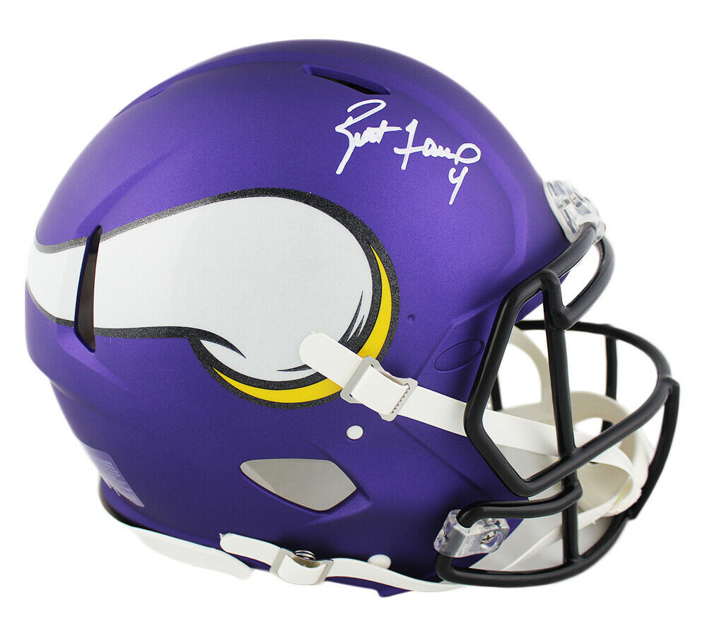 A Minnesota Vikings Speed Authentic NFL Helmet hand signed by Brett Favre. The item and signature are in excellent condition. Brett is one of the most iconic players in NFL history. A 20 year veteran of the NFL, Brett is a Super Bowl Champion, 11x Pro Bowler, 3x AP NFL Most Valuable Player, 4x NFL passing touchdowns leader, and 2x passing yards leader. His number, 4, has been retired by both the Green Bay Packers and the Southern Miss Golden Eagles. Brett was inducted into the Pro Football Hall of Fame in 2016. AUTHENTICATION: The item is accompanied by a Brett Favre Exclusive Certificate of Authenticity - Brett Favre Exclusive Serial Numbered and Databased Hologram - Picture of Brett from the signing