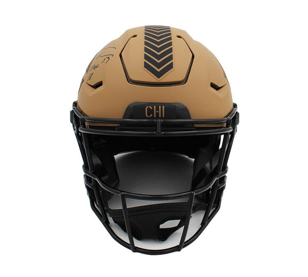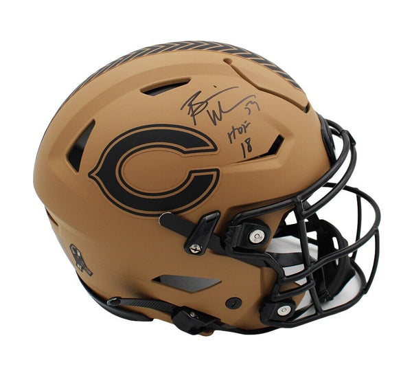 A Chicago Bears Speed Flex Authentic Salute to Service 2 NFL Helmet hand signed by Brian Urlacher. The item and signature are in excellent condition. In addition to signing his name, Brian also inscribed "HOF 18" on the item. Brian is a former American football linebacker who spent his entire 13-year career playing for the NFL Chicago Bears. He played college football for the University of New Mexico. The Bears selected Brian with the 9th overall pick in the 2000 NFL Draft. After winning the NFL Rookie of the Year Award in 2000, he was elected to eight Pro bowls, and won the NFL Defensive Player of the Year Award in 2005. AUTHENTICATION: The item is accompanied by a Beckett Serial Numbered and Databased Hologram