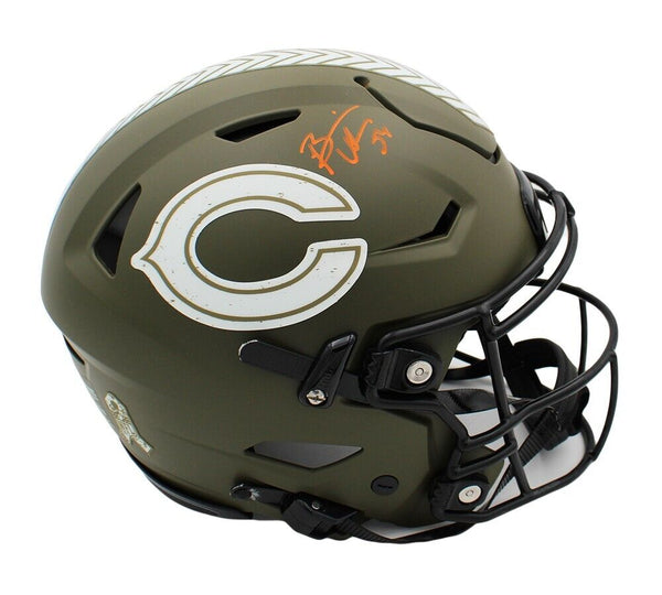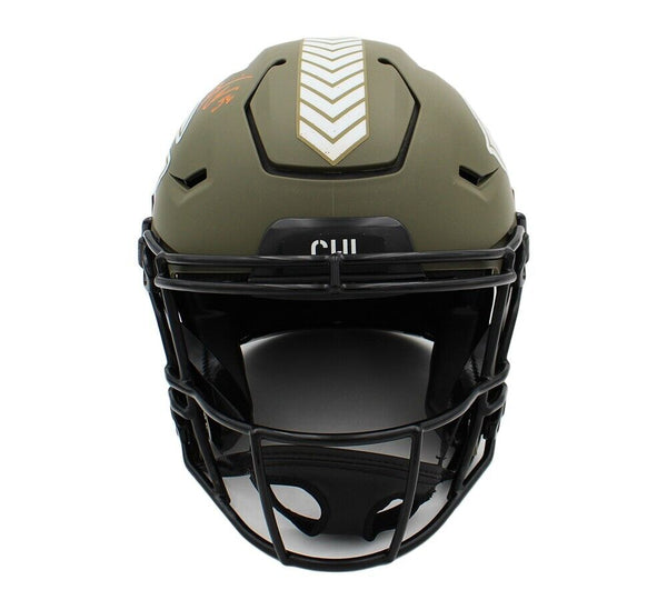 A Chicago Bears Speed Flex Authentic Salute to Service NFL Helmet Hand Signed by Brian Urlacher. The item and signature are in excellent condition. Brian is an 8x Pro Bowl, 4x First-team All-Pro, Second-team All-Pro, NFL Defensive Player of the Year, NFL Defensive Rookie of the Year, NFL 2000s All-Decade Team, & Consensus All-American. AUTHENTICATION: The item has been tagged with a SmarTag powered by Prova Technology, which gives you digital access to the items authentication records, including a proof picture from the signing.