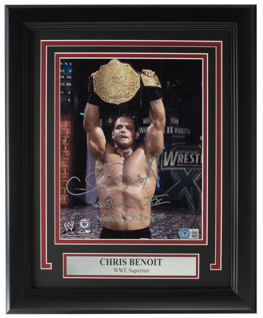 Featured is a Chris Benoit signed framed 8x10 WWE photo in which he added the "Wrestlemania XX, World Champion" inscriptions. The photo was hand signed by Chris Benoit and authenticated by Beckett authentication services. Included with the photo is a Beckett hologram and certificate of authentication. Brand new professional framing, double matted with an engraved nameplate. The frame measures approximately 11x14 in total size and the frame is ready for display. SPECIFICATIONS Autographed By: Chris Benoit Team: WWE Sport: Wrestling Authentication: Becket Grading Services