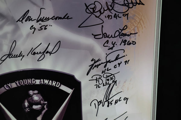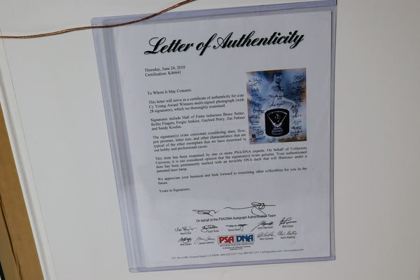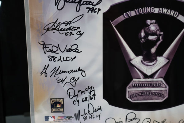 Cy Young Award Winners Multi-Signed 16x20 Photo - 24 Signatures Own an extraordinary piece of baseball history with this 16x20 photograph featuring authentic signatures from 24 Cy Young Award winners, with Hall of Famer Sandy Koufax prominently featured in the center. Featured Cy Young Award Winners: Center Signature: Sandy Koufax - Hall of Fame Dodgers legend Additional Signatures (23 more winners): Bob Gibson, Steve Carlton, Fergie Jenkins - Hall of Fame legends Gaylord Perry, Vida Blue, Dwight Gooden - Dominant aces Bob Welch, Denny McLain, Dean Chance - Championship pitchers Jim Lonborg, Pat Hentgen, Mike McCormick - Award winners Randy Jones, Ron Guidry, Jim Perry - Elite hurlers Barry Zito, LaMarr Hoyt, Willie Hernandez - Modern winners Jack McDowell, Sparky Lyle, Mark Davis - Relief and starting aces Mike Scott, Steve Bedrosian - Power pitchers What Makes This Legendary: 24 Cy Young Winners: The most comprehensive collection of pitching excellence PSA Authentication: Professional Sports Authenticator Letter of Authenticity included Sandy Koufax Center: Hall of Fame legend prominently featured Professional Framing: Museum-quality 16x20 presentation Specifications: Photo Size: 16x20 inches Total Signatures: 24 Cy Young Award winners Authentication: PSA Letter of Authenticity included Condition: Professionally framed and ready to display Perfect for serious baseball collectors or anyone who appreciates the greatest pitchers in MLB history all in one incredible piece.