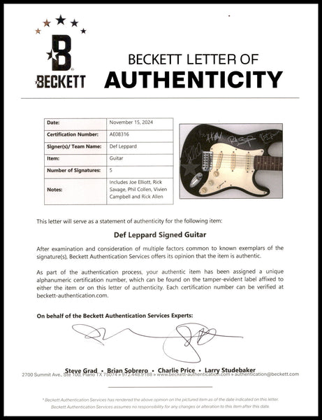 This is a Fender Guitar that has been hand signed by 5 members of Def Leppard. The band members that signed this guitar are Joe Elliott, Rick Allen, Phil Collen, Rick Savage & Vivian Campbell. This item has been certified authentic by Beckett Authentication (BAS) and comes with their tamper-proof hologram and matching full-page certificate of authenticity.