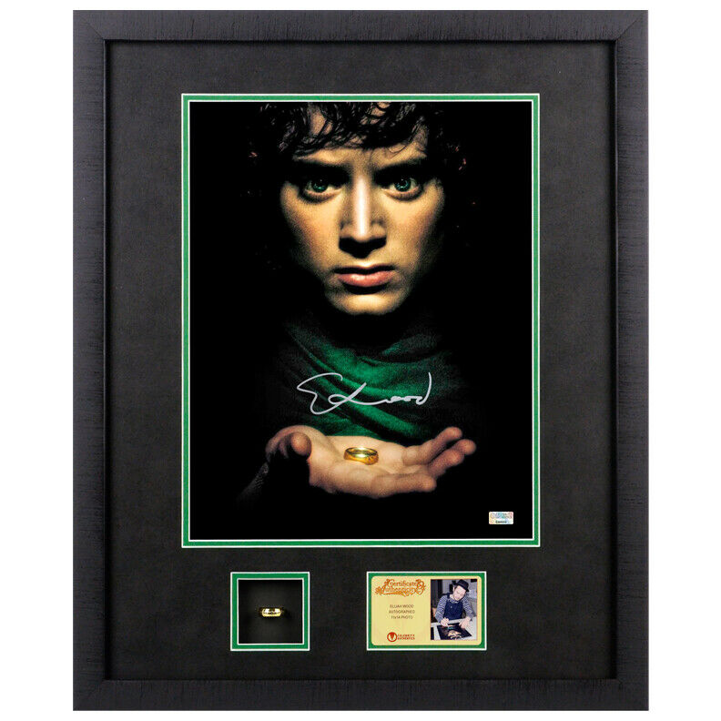 From the Framing Studios of Celebrity Authentics is this 11x"14" Framed Photo (approximately 18"x22" finished) of Elijah Wood as Frodo Baggins from Lord of the Rings, personally hand-signed by Elijah during his signing with Celebrity Authentics. Photo is beautifully framed with special edition and engraved Lord of the Rings collectors ring. Ships affixed with the Celebrity Authentics serial-numbered and tamper evident Authentication Hologram and includes Celebrity Authentics Certificate of Authenticity featuring picture of Elijah signing photo. Please note, due to their packaging, to help ensure their safe delivery we are unable to combine framed photos with other items. Framing: Photo is meticulously dry mounted and framed using acid free backing and mat boards with white core for the finest in presentation. UV protective glass with precision cut moulding are used for smooth, clean frame edges, hand assembled in our studio. Additionally, a protective back cover is used to seal the piece with corner bumpers applied to protect your walls, providing adequate air flow. A hanger is affixed to complete the finished collectible. Each framed photo is carefully wrapped for shipping with double protective corners and cushioning to help ensure the item's safe arrival. Celebrity Authentics Framing Studios - acclaimed as the industry's finest! Please note: with multiples signed by the actor, a sample photo is used from stock to represent what you will receive. Exact autograph size and placement may vary.