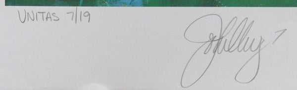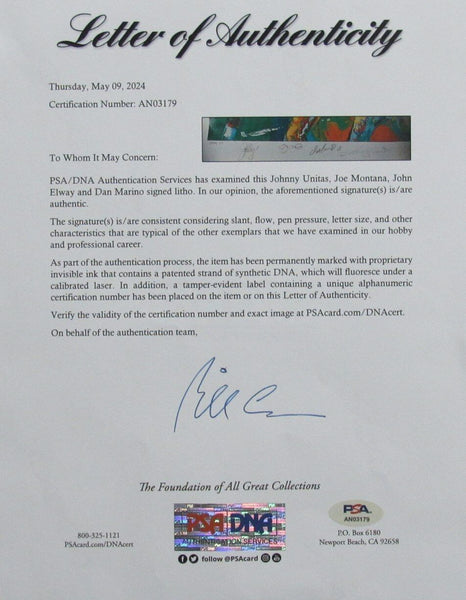John Elway/Johnny Unitas/Joe Montana/Dan Marino Multi-signed/Autographed 30x24 Poster. This poster is authenticated by PSA/DNA and includes their Tamper-proof Sticker and Certificate of Authenticity.