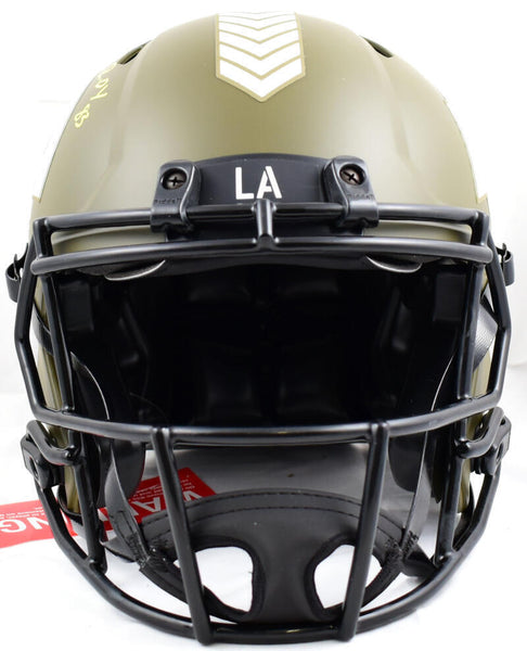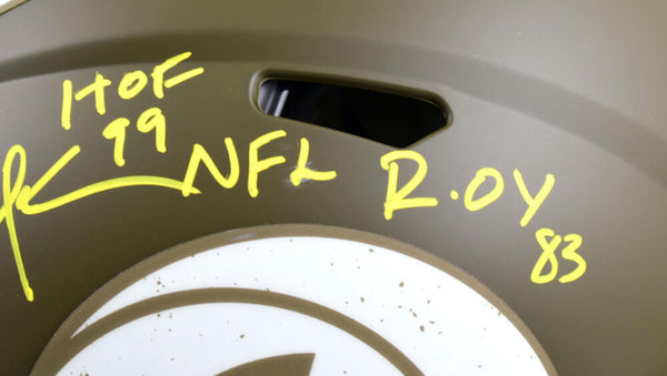 Eric Dickerson Autographed F/S Rams Salute to Service Speed Authentic Helmet W/3 insc. - Beckett W Hologram *Yellow This is a Hand Autographed Helmet of Eric Dickerson of The Los Angeles Rams. This is a Riddell Football Full Salute to Service Speed Authentic Helmet. Inscribed HOF, 2105 yds, ROY 83. This item has a Beckett Witness Authentication, which comes with a Beckett numbered sticker hologram and a QR code for verification. You can view this item on the Beckett Authentication website. It was signed either at a public autograph appearance or a private signing. This is a stock photo of the item. Although you may not receive this exact item, the item you receive is virtually identical and brand new in great shape.