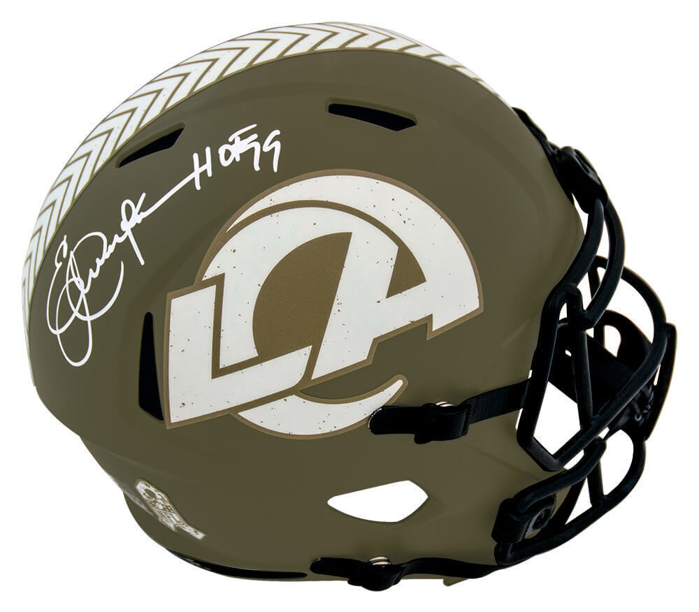 Eric Dickerson signed Los Angeles Rams Salute to Service Riddell full size speed replica helmet with 'HOF 99' inscription. Item comes with a Schwartz Sports Memorabilia tamper-proof numbered hologram and Certificate of Authenticity which can be verified online.