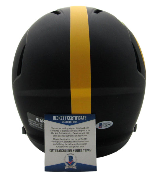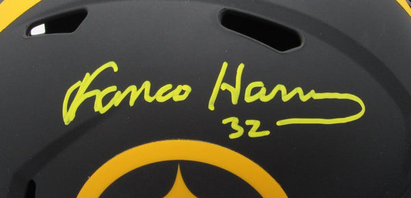 Franco harris hof autographed black full size eclipse alternate replica football helmet pittsburgh steelers. this helmet is authenticated by bas/beckett and includes their tamper-proof sticker and certificate of authenticity.