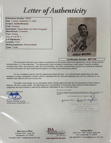 Featured is a Gorilla Monsoon signed 8x10 WWE WWF photo. This photo has been hand signed by Monsoon and comes with the JSA hologram and letter of authenticity. This photo has been professionally framed and matted and is approximately 11x14. This photo would make a great addition to any sports memorabilia collection!. SPECIFICATIONS Autographed By: Gorilla Monsoon Team: Sport: Wrestling Authentication: James Spence Authentication (JSA)