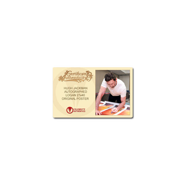 Celebrity Authentics is the exclusive autograph partner of Hugh Jackman. Please be aware most other online autographs purported to be Mr. Jackman's are forgeries. Mr. Jackman has only signed with Celebrity Authentics so be sure the item you choose is affixed with the Celebrity Authentics Authentication Hologram for his genuine signature.This 2017 Logan Original 27x40 Double-Sided Movie Poster has been personally autographed by Hugh Jackman during his exclusive signing with Celebrity Authentics. In the near future, a weary Logan (Hugh Jackman) cares for an ailing Professor X (Patrick Stewart) at a remote outpost on the Mexican border. His plan to hide from the outside world gets upended when he meets a young mutant (Dafne Keen) who is very much like him. Logan must now protect the girl and battle the dark forces that want to capture her. Ships affixed with Celebrity Authentics serial-numbered Authentication hologram and includes Celebrity Authentics Certificate of Authenticity featuring picture of Hugh signing poster.Please note: with multiples signed by the actor, a sample photo is used from stock to represent what you will receive. Exact autograph size and placement may vary.