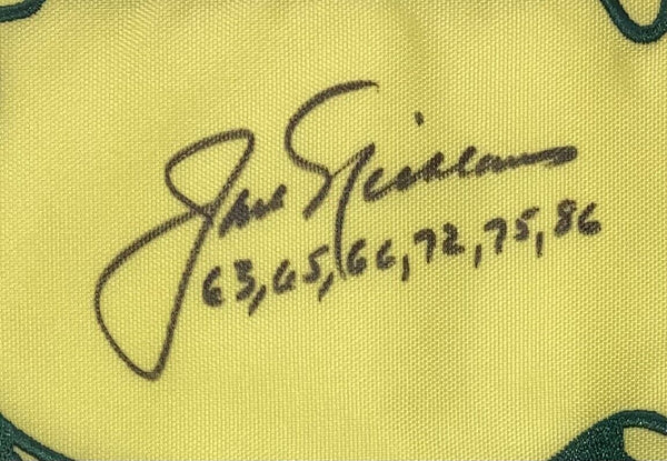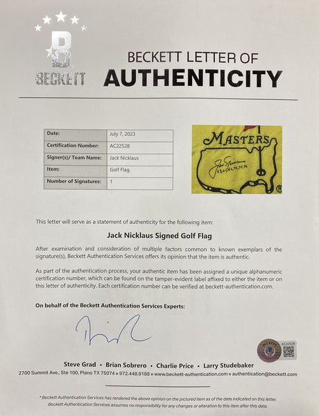 Featured is a Jack Nicklaus signed Masters golf flag, inscribed "63,65,66,72,75,86". This flag was hand signed by Nicklaus and comes with the Beckett hologram and letter of authenticity. This flag has been professionally framed and matted and is approximately 22x27. This flag would make a great addition to any sports memorabilia collection! SPECIFICATIONS Autographed By: Nicklaus Team: Sport: Golf-PGA Authentication: Beckett Grading Services