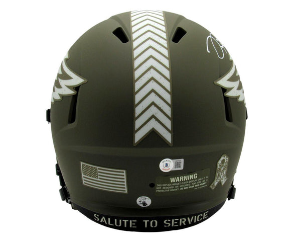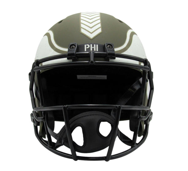 Jalen hurts autographed full size green salute to service replica football helmet philadelphia eagles. this helmet is authenticated by bas/beckett and includes their tamper-proof hologram sticker.