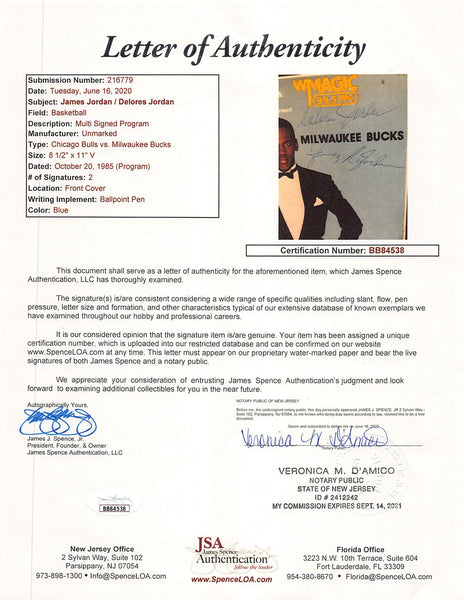 This Autographed October 20, 1985 Chicago Bulls Vs Milwaukee Bucks Pre-Season Program has been Personally Signed by James Jordan & Dolores Jordan. This item is 100% Authentic to include a Certificate of Authenticity (COA) / hologram by JSA. The authenticity can be verified on JSA website.