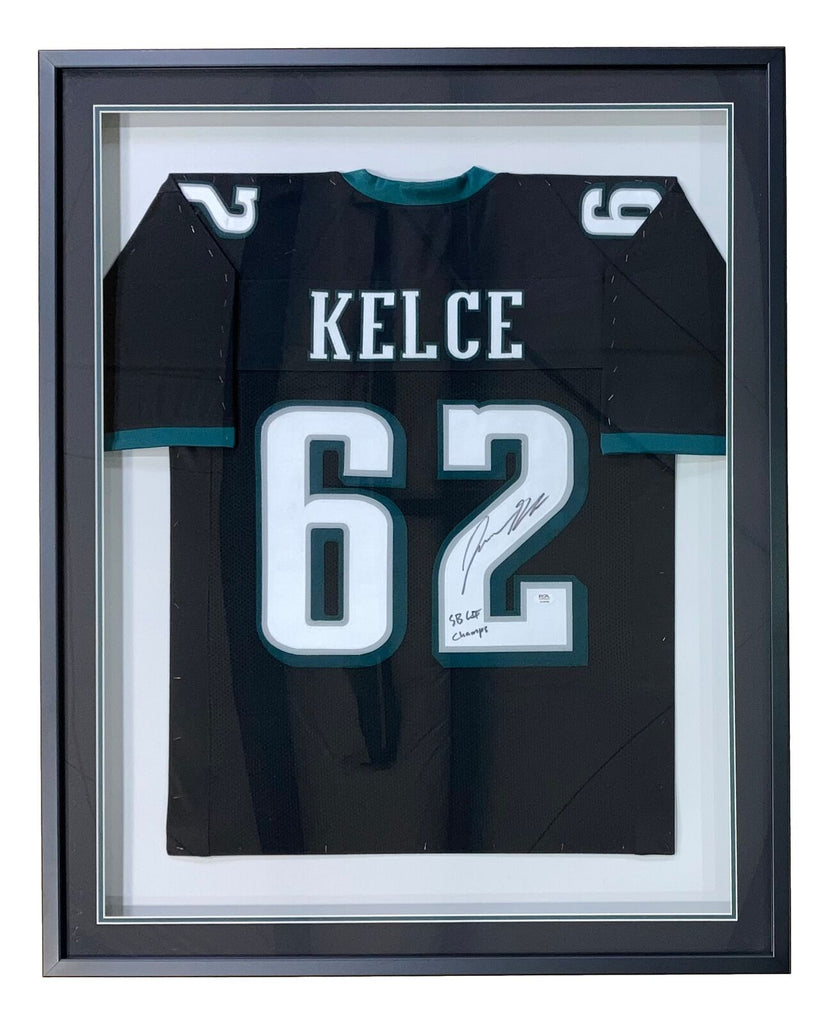 Featured is a Jason Kelce signed custom football jersey, inscribed "SB LII Champs". This jersey has been hand signed by Kelce and comes with the PSA witnessed hologram and certificate of authenticity. This jersey features professionally sewn letters and is size XL. This jersey has no team tags or emblems and is intended as a sports collectible. This jersey has been professionally framed and matted and is approximately 32x38. This jersey would make a great addition to any sports memorabilia collection! SPECIFICATIONS Autographed By: Jason Kelce Team: Philadelphia Eagles Sport: Football Authentication: Professional Sports Authenticator (PSA)
