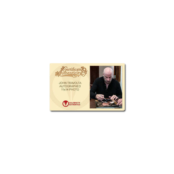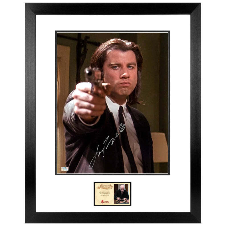 This 11x14 iconic photo of Vincent Vega from Tarantino's Pulp Fiction has been personally hand-signed by John Travolta during his signing with Celebrity Authentics. Vincent Vega is a hitman based in Los Angeles, working for mob boss Marsellus Wallace. His partner and best friend is Jules Winnfield. In the film, Vincent is tasked with Jules to visit a gang of students in a flat to retrieve a briefcase belonging to Marsellus. Ships affixed with Celebrity Authentics serial-numbered and tamper evident Authentication Hologram and includes Celebrity Authentics Certificate of Authenticity featuring picture of John signing photo. Photo is meticulously dry mounted and framed using acid free backing and mat boards with white core for the finest in presentation. UV protective glass with precision cut moulding are used for smooth, clean frame edges, hand assembled in our studio. Additionally, a protective back cover is used to seal the piece with corner bumpers applied to protect your walls, providing adequate air flow. A hanger is affixed to complete the finished collectible. Each framed photo is carefully wrapped for shipping with double protective corners and cushioning to help ensure the item's safe arrival. Celebrity Authentics Framing Studios - acclaimed as the industry's finest! Please note: with multiples signed by the actor, a sample photo is used from stock to represent what you will receive. Exact autograph size and placement may vary.