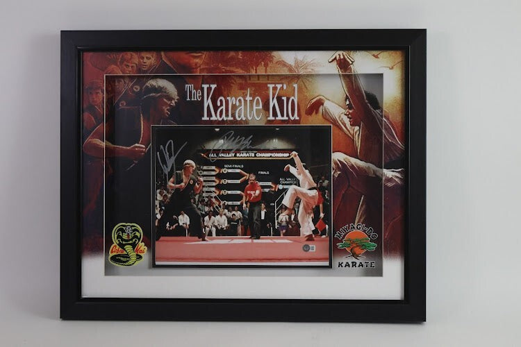 The Karate Kid Dual Autographed 11x14 Photo Relive the iconic rivalry with this extraordinary Karate Kid dual-autographed 11x14 photo featuring signatures from both William Zabka (Johnny Lawrence) and Ralph Macchio (Daniel LaRusso). This premium collectible captures the timeless battle between the Cobra Kai and Miyagi-Do philosophies that has captivated audiences for decades. Iconic Features: Dual Signatures: Hand-signed by both William Zabka and Ralph Macchio Premium 11x14 Photo: High-quality glossy print perfect for framing Beckett Certificate of Authenticity: Professionally authenticated and guaranteed genuine Timeless Appeal: Celebrates the enduring legacy of The Karate Kid franchise Ready to Frame: Perfect size for standard 11x14 frames and matting This remarkable piece brings together the two central characters who defined a generation's understanding of martial arts, mentorship, and redemption. William Zabka's Johnny Lawrence and Ralph Macchio's Daniel LaRusso represent one of cinema's most compelling rivalries, later beautifully explored in the hit series Cobra Kai. The photo captures the essence of their complex relationship - from teenage adversaries to adult rivals finding common ground. Both actors have experienced incredible career resurgences thanks to Cobra Kai, making their dual signatures even more valuable to collectors. Perfect for: 80s movie fans, Karate Kid enthusiasts, Cobra Kai series collectors, martial arts fans, or anyone who appreciates classic coming-of-age cinema. This authenticated piece makes an outstanding addition to any entertainment memorabilia collection. Whether displayed in a home theater, office, or man cave, this dual-signed photo serves as a conversation starter and a tribute to one of the most beloved underdog stories in film history. Includes official Beckett Authentication Services Certificate of Authenticity guaranteeing both signatures.