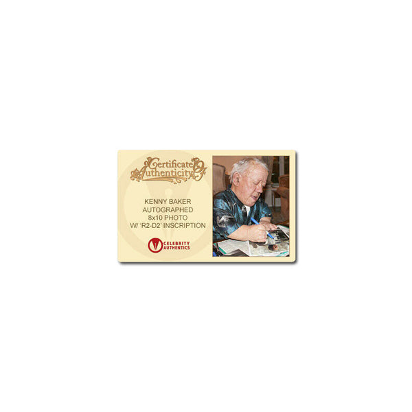 This 8x10 photo from Star Wars: Episode IV - A New Hope of the late Kenny Baker as R2-D2 has been personally hand-signed by Kenny during his autograph signing with Celebrity Authentics. Classic shot ships affixed with Celebrity Authentics serial-numbered and tamper evident Authentication Hologram and includes Celebrity Authentics Certificate of Authenticity featuring picture of Kenny signing photo. Please note: with multiples signed by the actor, a sample photo is used from stock to represent what you will receive. Exact autograph size and placement may vary.