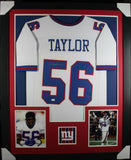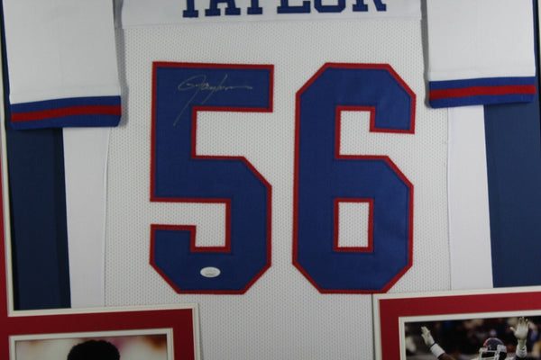 LAWRENCE TAYLOR AUTOGRAPHED & PROFESSIONALLY FRAMED PRO-STYLE JERSEY(Numbers are slightly crooked but the jersey is framing perfectly straight, issue with stitched numbers)Every framed autographed jersey is accompanied with a tamper-proof hologram on the signed part of the jersey from one of the main authenticators in the industry (JSA, Beckett, PSA, etc.) and can be verified on their corresponding websites to prove authenticity.THE FRAMED JERSEY MEASURES 35"x 44" & COMES WITH THE FOLLOWING:-UV Protected Acrylic-Triple Acid Free Team Colored Matting-2 High Quality 8"x10" Photos-Team Logo