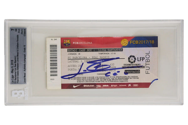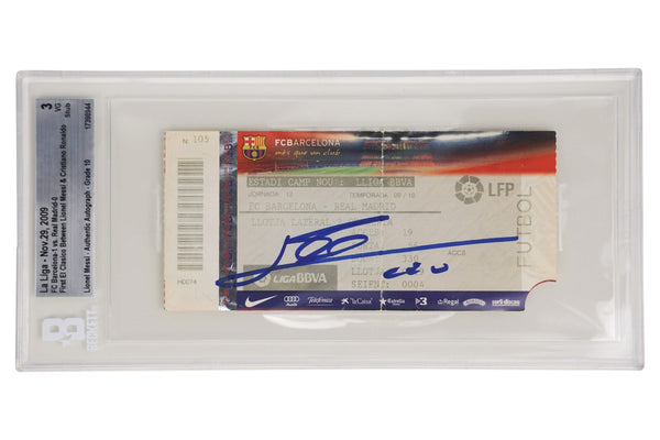 This is a Lionel Messi Signed First & Final El Clasico with Ronaldo Match Tickets - BGS. THE ITEM IN THE PICTURE IS A STOCK IMAGE. YOU WILL RECEIVE AN IDENTICAL ITEM OF EQUAL QUALITY. ALL JERSEYS ARE SIZE LARGE. Every item of signed memorabilia we sell is official and of the highest quality. We pride ourselves on providing sports fans with the most exclusive signed memorabilia on the market. We are an industry leading signed memorabilia company who can guarantee 100% authenticity on every signature we sell. The item you receive will be identical to the one you are seeing in the stock pictures. This includes the item, the authentication company, signature color and signature placement. We take pride in ensuring the authenticity of all our items. With unwavering commitment, we guarantee that every signature is 100% authentic. Every item of signed memorabilia comes with a scannable barcode which takes you to the certificate of authenticity on the company's website. These industry leading authentication companies include Beckett Authentication Services, James Spencer Authentication Services and Professional Sports Authentication Services.