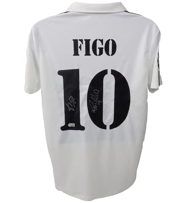 This is a Luis Figo & Ronaldo Nazario Signed Real Madrid FC Soccer Jersey with Beckett COA. THE ITEM IN THE PICTURE IS A STOCK IMAGE. YOU WILL RECEIVE AN IDENTICAL ITEM OF EQUAL QUALITY. ALL JERSEYS ARE SIZE LARGE. Every item of signed memorabilia we sell is official and of the highest quality. We pride ourselves on providing sports fans with the most exclusive signed memorabilia on the market. We are an industry leading signed memorabilia company who can guarantee 100% authenticity on every signature we sell. The item you receive will be identical to the one you are seeing in the stock pictures. This includes the item, the authentication company, signature color and signature placement. We take pride in ensuring the authenticity of all our items. With unwavering commitment, we guarantee that every signature is 100% authentic. Every item of signed memorabilia comes with a scannable barcode which takes you to the certificate of authenticity on the company's website. These industry leading authentication companies include Beckett Authentication Services, James Spencer Authentication Services and Professional Sports Authentication Services.