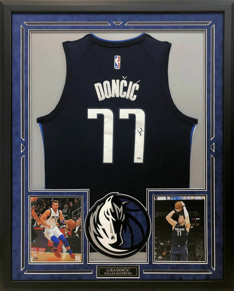 Luka Doncic Dallas Mavericks autographed and custom framed jersey. This jersey is masterfully framed as the jersey is hand-sewn rather than glued or stapled to ensure the jersey is not damaged in any way during the framing process. All of our materials are museum quality and acid-free, not just cheap acid buffered paper matting. The suede matting and white bevels really make this frame job pop! The frame is real wood measures 35.5 inches x 43.5 inches.