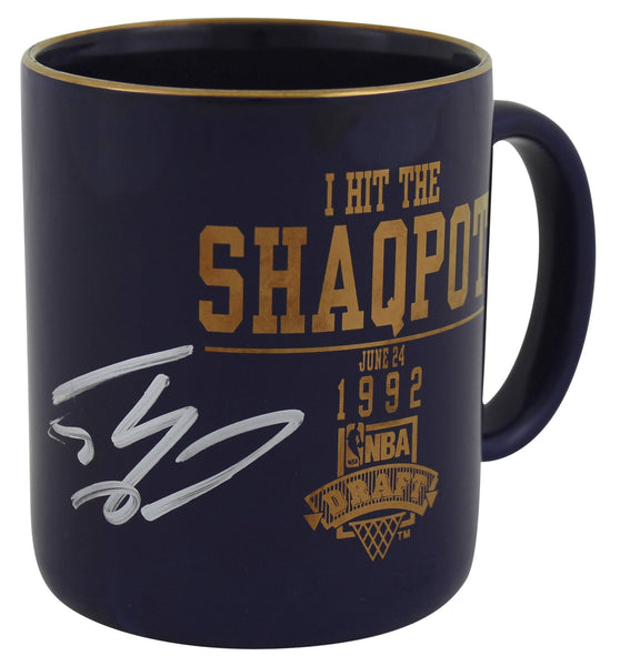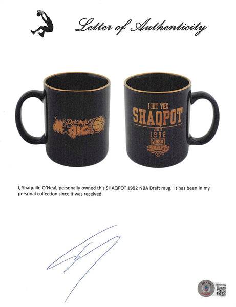 This Autographed I Hit the Shaqpot 1992 NBA Draft Coffee Mug has been Personally Signed by Shaquille O'Neal of the Orlando Magic. This item is 100% Authentic to include a hologram by Beckett Authentication Services. This item will come with the new Beckett Authentication hologram that has a scannable QR code rather than the traditional COA. If you would like to have a COA, you are welcome to reach out to Beckett for a printed certification once you receive your item. This is a BAS Witnessed Protection Program item which means a Beckett Authentication Service representative was present when this item was being signed. The authenticity can be verified on Beckett Authentication Services website. This Shaqpot mug comes directly from Shaquille O'Neal's personal collection. It comes with a signed LOA from Shaquille O'Neal as well.