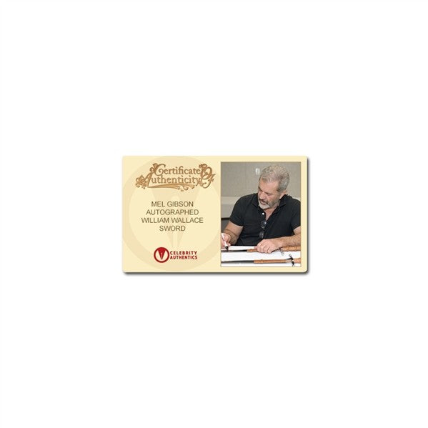 Celebrity Authentics is the exclusive autograph partner of Mel Gibson. Please be aware most other online autographs purported to be Mr. Gibson's are forgeries. Mr. Gibson has only signed with Celebrity Authentics so be sure the item you choose is affixed with the Celebrity Authentics Authentication Hologram for his genuine signature.This Braveheart William Wallace Sword has been personally autographed by William Wallace himself, Mel Gibson, during his signing with Celebrity Authentics. Reclaim your Freedom from the tyrannical English king with this authentic William Wallace sword! This sword is a replica of the sword William Wallace wielded in the movie Braveheart. The sword comes complete with a rough leather sheath that includes a strap to attach this 40.75 inch sword to your belt. Polished stainless steel, polished metal hilt and pommel, leather wrapped handle, rough leather sheath with belt strap, 40.75 inch overall length and 29.5 inch stainless steel double edged blade! In keeping with the 1200s, sword may have variances in the leather, blade and alignment. William Wallace is the medieval Scottish patriot who is spurred into revolt against the English when the love of his life is slaughtered. Leading his army into battles that become a war, his advance into England threatens King Edward I's throne before he is captured and executed, but not before becoming a symbol for a free Scotland. Ships affixed with Celebrity Authentics serial-numbered and tamper evident Authentication Hologram and includes Celebrity Authentics Certificate of Authenticity featuring picture of Mel signing sword.Please note: with multiples signed by the actor, a sample photo is used from stock to represent what you will receive. Exact autograph size and placement may vary.