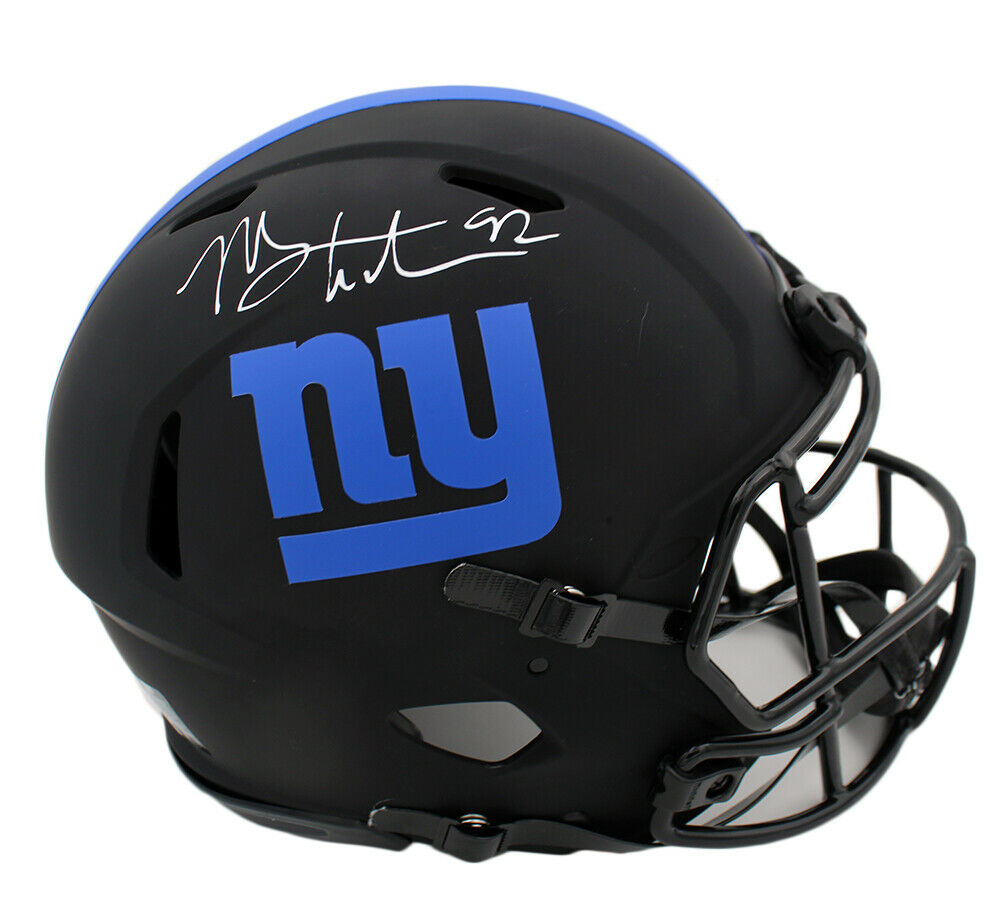 A New York Giants Speed Authentic Eclipse NFL Helmet hand signed by Michael Strahan. The item and signature are in excellent condition. Michael is a former professional football player who was a defensive end and spent his entire 15-year career with the New York Giants. Strahan set a record for the most sacks in a season in 2001, and helped the Giants win Super Bowl XLII over the New England Patriots in his final season in 2007. AUTHENTICATION: The item is accompanied by a Certificate of Authenticity - Serial Numbered and Databased Hologram - Picture of Michael from the Signing