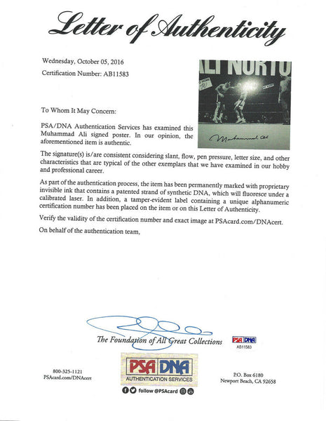 This is a 14.5x19.5 Fight Poster Photo that has been hand signed by Muhammad Ali. It has been certified authentic by PSA/DNA and comes with their sticker and matching full page certificate of authenticity.