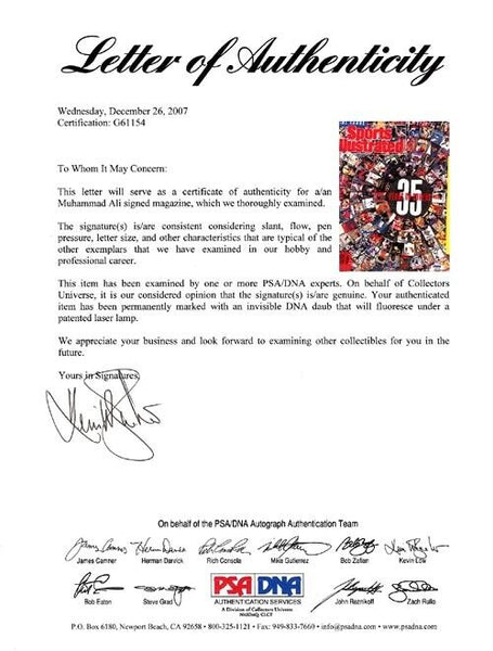 This is a Magazine that has been hand signed by Muhammad Ali. It has been authenticated by PSA/DNA and comes with their sticker and matching full page certificate. Approximate size is 10 by 12.
