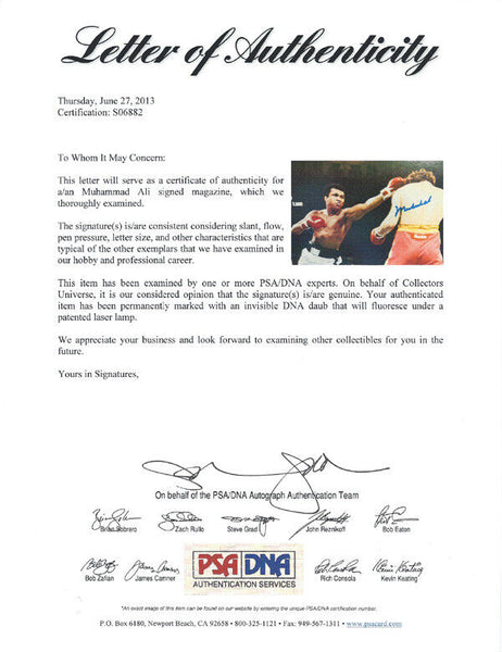 This is a Sports Illustrated Magazine that has been hand signed by Muhammad Ali. It has been certified authentic by PSA/DNA and comes with their sticker and matching full page certificate of authenticity.