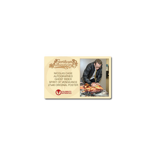 Celebrity Authentics is the exclusive autograph partner of Nicolas Cage. Please be aware most other online autographs purported to be Mr. Cage's are forgeries. Mr. Cage has only signed with Celebrity Authentics so be sure the item you choose is affixed with the Celebrity Authentics Authentication Hologram for his genuine signature.This rare 2017 Ghost Rider Spirit of Vengeance Original 27x40 Double-Sided Movie Poster has been personally autographed by Johnny Blaze himself, Nicolas Cage during his exclusive signing with Celebrity Authentics. Now hiding out in Eastern Europe, Johnny Blaze (Nicolas Cage) is still struggling with the curse of the Ghost Rider -- the devil's bounty hunter. Johnny meets a priest named Moreau (Idris Elba), who asks Johnny to find a boy named Danny (Fergus Riordan) and bring him back. But there's a catch -- Satan (Ciaran Hinds) is looking for the boy too, and has a personal stake in the matter. But if Johnny can find Danny first and save the boy's soul, there's a chance Johnny can save his own soul as well. Poster may have minor edge wear and ships affixed with Celebrity Authentics serial-numbered Authentication hologram and includes Celebrity Authentics Certificate of Authenticity featuring picture of Nic signing the poster. Please note: with multiples signed by the actor, a sample photo is used from stock to represent what you will receive. Exact autograph size and placement may vary.