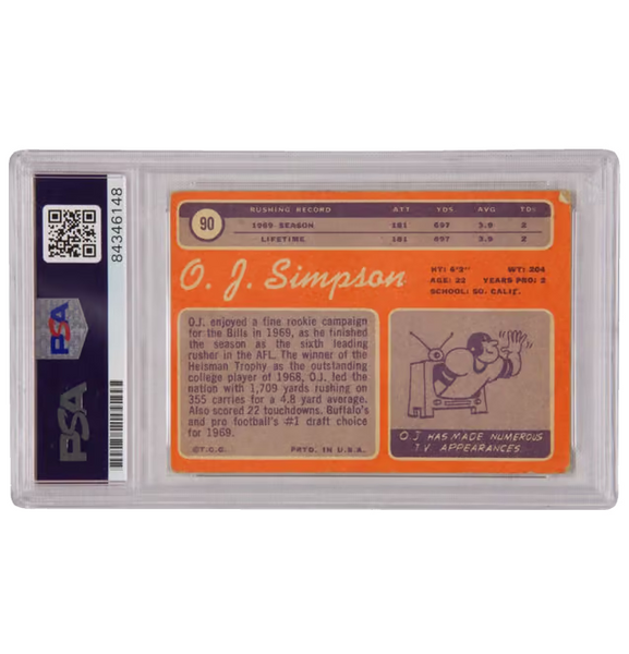 This is a O.J. Simpson Signed 1970 Topps Inscribed "11,236 Yards 61 TDS" - PSA Authentic. THE ITEM IN THE PICTURE IS A STOCK IMAGE. YOU WILL RECEIVE AN IDENTICAL ITEM OF EQUAL QUALITY. ALL JERSEYS ARE SIZE LARGE. Every item of signed memorabilia we sell is official and of the highest quality. We pride ourselves on providing sports fans with the most exclusive signed memorabilia on the market. We are an industry leading signed memorabilia company who can guarantee 100% authenticity on every signature we sell. The item you receive will be identical to the one you are seeing in the stock pictures. This includes the item, the authentication company, signature color and signature placement. We take pride in ensuring the authenticity of all our items. With unwavering commitment, we guarantee that every signature is 100% authentic. Every item of signed memorabilia comes with a scannable barcode which takes you to the certificate of authenticity on the company's website. These industry leading authentication companies include Beckett Authentication Services, James Spencer Authentication Services and Professional Sports Authentication Services.