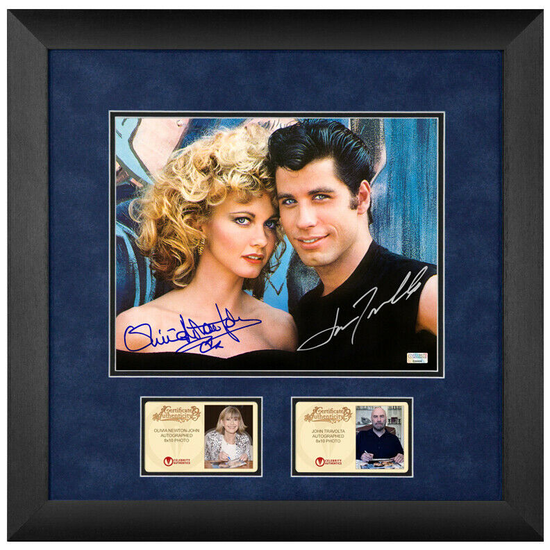 Celebrity Authentics was the exclusive autograph partner of Olivia Newton-John. Please be aware most other online autographs purported to be Ms. Newton-John's are forgeries. Ms. Newton-John only signed with Celebrity Authentics so be sure the item you choose is affixed with the Celebrity Authentics Authentication Hologram for her genuine signature.From the Framing Studios of Celebrity Authentics is this 8"x10" Framed Photo (approximately 18"x14" finished) of Sandy and Danny from Grease, personally hand-signed by Olivia Newton-John and John Travolta during their signings with Celebrity Authentics. Ships affixed with the Celebrity Authentics serial-numbered and tamper evident Authentication Hologram and includes Celebrity Authentics Certificates of Authenticity featuring picture of Olivia and John signing photo. Please note, due to their packaging, to help ensure their safe delivery we are unable to combine framed photos with other items. Stock image used for product images. Item ships with clean, unsmudged autograph in similar location. Photo is meticulously dry mounted and framed using acid free backing and mat boards with white core for the finest in presentation. UV protective glass with precision cut moulding are used for smooth, clean frame edges, hand assembled in our studio. Additionally, a protective back cover is used to seal the piece with corner bumpers applied to protect your walls, providing adequate air flow. A hanger is affixed to complete the finished collectible. Each framed photo is carefully wrapped for shipping with double protective corners and cushioning to help ensure the item's safe arrival. Celebrity Authentics Framing Studios - acclaimed as the industry's finest! Please note: with multiples signed by the actor, a sample photo is used from stock to represent what you will receive. Exact autograph size and placement may vary.