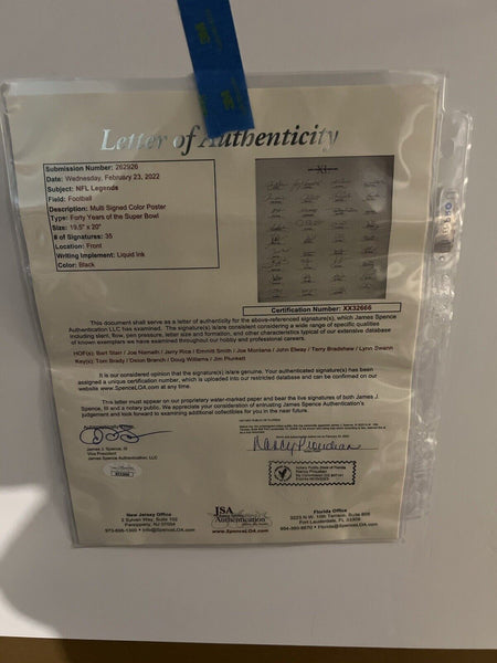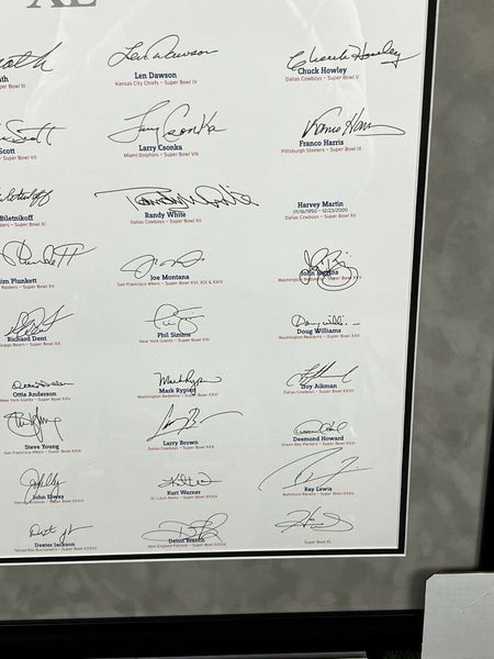 This Opus Super Bowl XL MVP signature page custom framed to 27x27 has been personally hand-signed by every living MVP from Super Bowl I to XL in 2006. Autographed by Bart Starr, Joe Namath, Len Dawson, Chuck Howley, Roger Staubach, Jake Scott, Larry Csonka, Franco Harris, Lynn Swann, Fred Biletnikoff, Randy White, Terry Bradshaw, Jim Plunkett, Joe Montana, John Riggins, Marcus Allen, Richard Dent, Phil Simms, Doug Williams, Jerry Rice, Ottis Anderson, Mark Rypien, Troy Aikman, Emmitt Smith, Steve Young, Larry Brown, Desmond Howard, Terrell Davis, John Elway, Kurt Warner, Ray Lewis, Tom Brady, Dexter Jackson, Deion Branch and Hines WardOnly 400 ever signed100% Authentic Certificate of authenticity by JSA w/ full letter